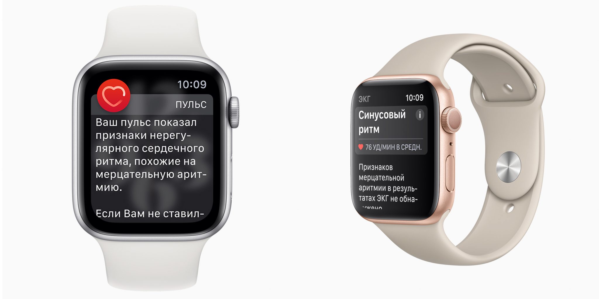 Отслеживать сердечный ритм часы могут с помощью электродов, встроенных в заднюю панель и в колесико устройства, пользователь может записывать ЭКГ, если Apple Watch уведомили владельца о нестабильном сердечном ритме. Для записи сердечных сокращений нужно просто удерживать колесико часов. Вся информация о пульсе и сердцебиении сохраняется в приложении «Здоровье», в дальнейшем владелец часов может поделиться данными с врачом в PDF формате. Приложение «ЭКГ» в ходе проверок и клинических испытаний на более чем 600 участниках показало точность определения диагноза мерцательная аритмия в 98.3% случаев. При обнаружении симптомов нерегулярного сердечного ритма приложение дает определенные инструкции о том, что необходимо сделать пользователю незамедлительно. Несомненно, Apple Watch является не просто красивым аксессуаром, а незаменимым помощником, который поможет предотвратить множество проблем со здоровьем.