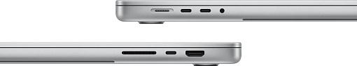 MacBook Pro 14", выполненный в серебристом цвете, обладает элегантным и узнаваемым дизайном. Прочная алюминиевая конструкция, компактные размеры и минимальный вес делают его идеальным спутником как для работы, так и для развлечений.